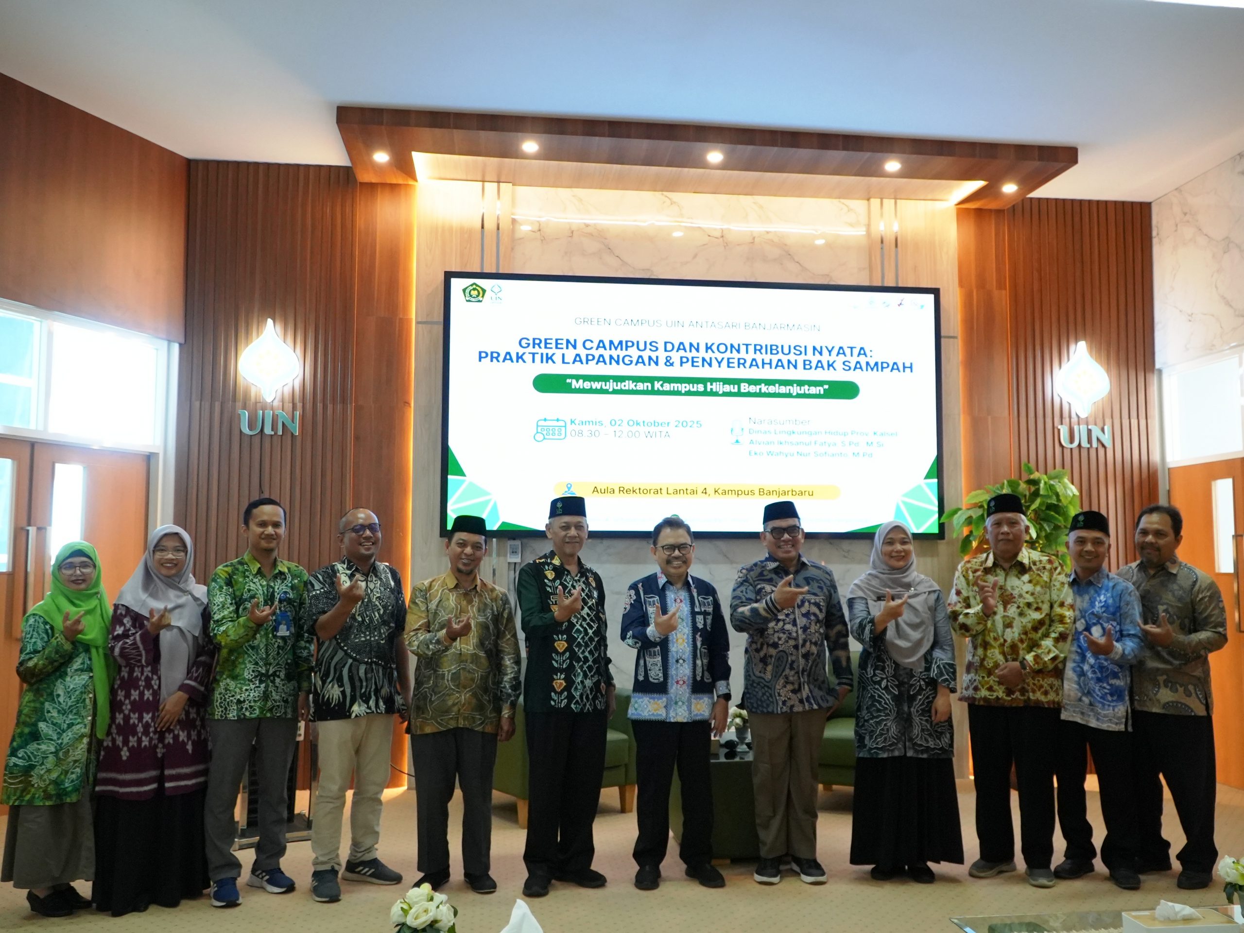 BANJARBARU – Berlangsung di Aula Rektorat Lantai 4 Kampus 2 Banjarbaru, Tim Green Campus UIN Antasari mewujudkan aksi nyata melindungi lingkungan, Kamis (2/10/2025). Aksi tersebut dikemas dengan Sosialisasi Green Campus dan Kontribusi Nyata: Praktik Lapangan dan Penyerahan Bak Sampah, dengan mengusung tema “Mewujudkan Kampus Hijau Berkelanjutan”.